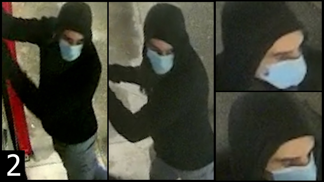 Le 1er individu portait une veste matelassée foncée avec une capuche bordée de fourrure, un sweat bleu à capuche, un pantalon de training bleu, une casquette foncée et des baskets foncées.