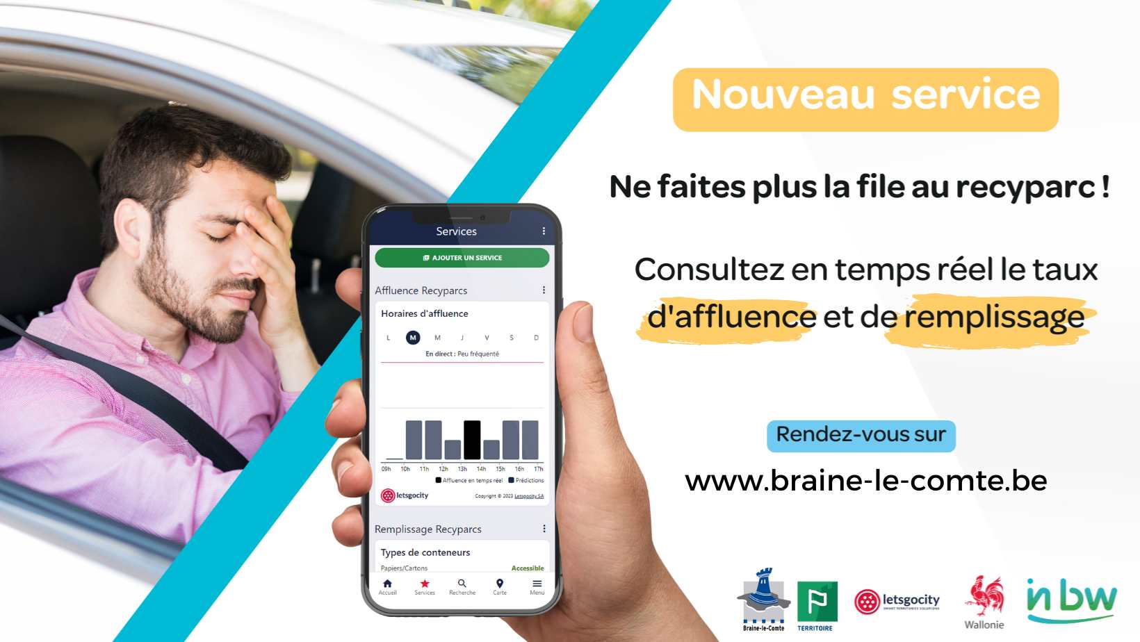 L’intercommunale du Brabant wallon qui gère le recyparc de Braine (le seul du Centre à ne pas dépendre d’Hygea) a mis au point un outil bien utile : un app qui permet de connaitre en temps réel le taux de saturation du parc (en fonction du nombre de voiture qui sont à l’intérieur du site). Elle indique aussi le taux de remplissage des divers conteneurs. Vous saurez donc si les déchets que vous avez chargés dans votre coffre ou remorque pourront être déposés.