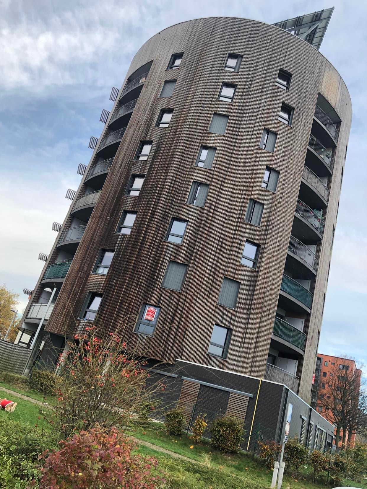 Interpellante, cette tour l’est à plus d’un titre tant pour ses propriétés énergétiques que pour sa forme cylindrique-singulière. En 2013, ce projet entièrement passif était avant-gardiste. Centr’Habitat voulait servir d’exemple en proposant ce bâtiment bardé de bois et dont le toit est équipé de panneaux photovoltaïques et thermiques.