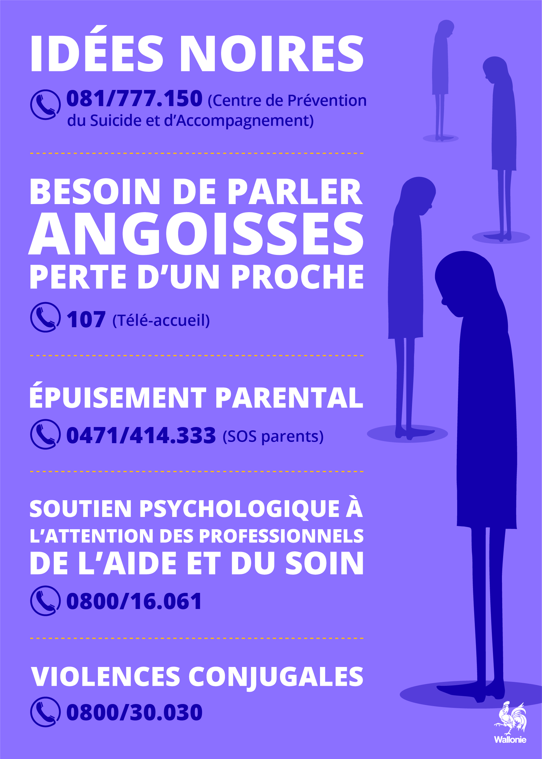 La crise sanitaire liée à la pandémie du Coronavirus est lourde de conséquences tant au niveau physique que psychologique. Besoin d'une écoute, d'une oreille attentive? Voici, en annexe, une affiche reprenant des numéros de téléphone qui pourraient être utiles.