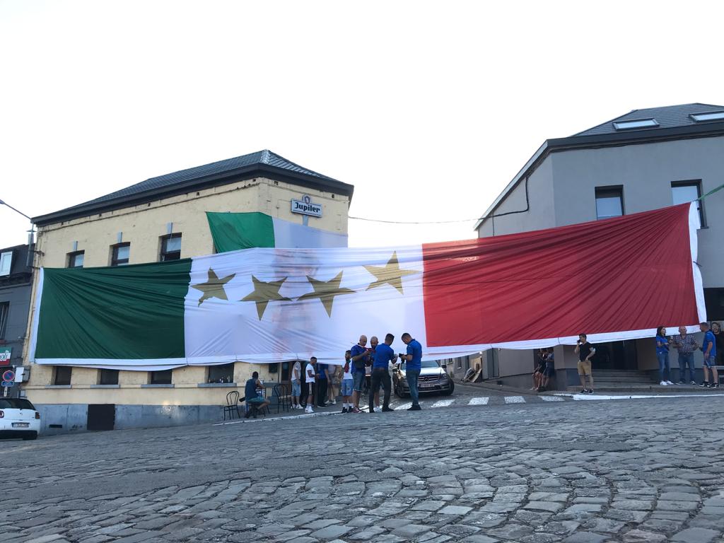 Avec ses 28 mètres de long étendus entre deux façades, le drapeau, ici dans le quartier, impressionne. Voilà trois ans qu'il attendait d'être déployé. Aujourd'hui il prend vie et redonne des couleurs aux supporters. Habituellement rivaux en championnat, les clubs de supporters de la Juve et du Milan sont aujourd'hui réunis sous la même bannière. Trois établissements bien connus à Morlanwelz se sont d'ailleurs ligués autour de ce tifo.
