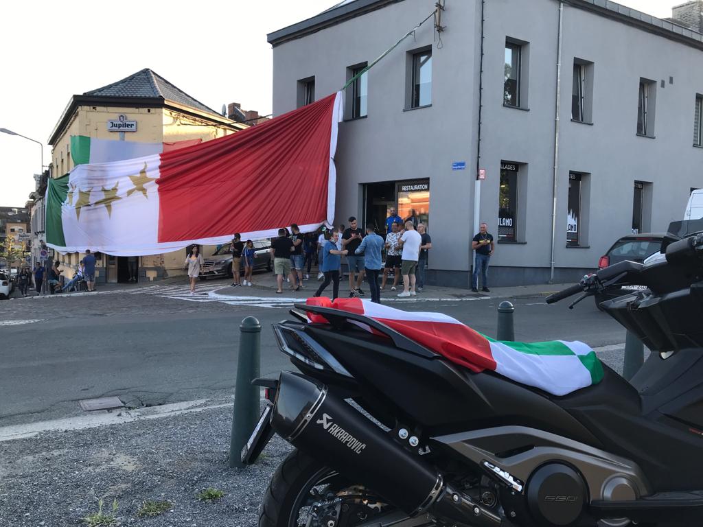 Euro 2020 : à l'occasion du match Italie-Suisse, hier, plusieurs cafetiers et restaurateurs du plateau de la gare à Morlanwelz avaient décidé de marquer le coup en installant, dans la rue, un énorme tiffo aux couleurs de l'Italie... L'endroit était tout désigné pour y faire" la fête aux klaxons" après la victoire.