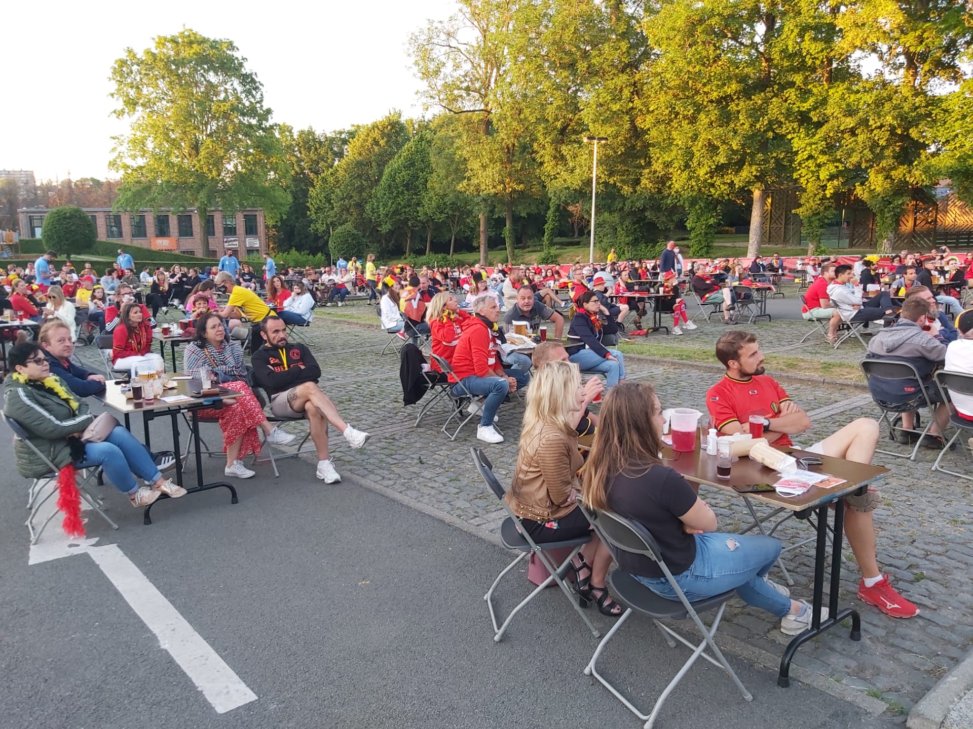 Un premier but belge signé Lukaku à la 10ème minute, un 2 ème dès la 33ème minute par un Meunier qui vient juste de fouler la pelouse. C’est dire si, malgré la blessure de Castagne, les supporters confortablement et sagement assis à 4 par tables, étaient heureux et pour le moins optimiste à la mi-temps. Pour la 2ème mi-temps, certains s’essayent même aux pronostics avec un certain brio.