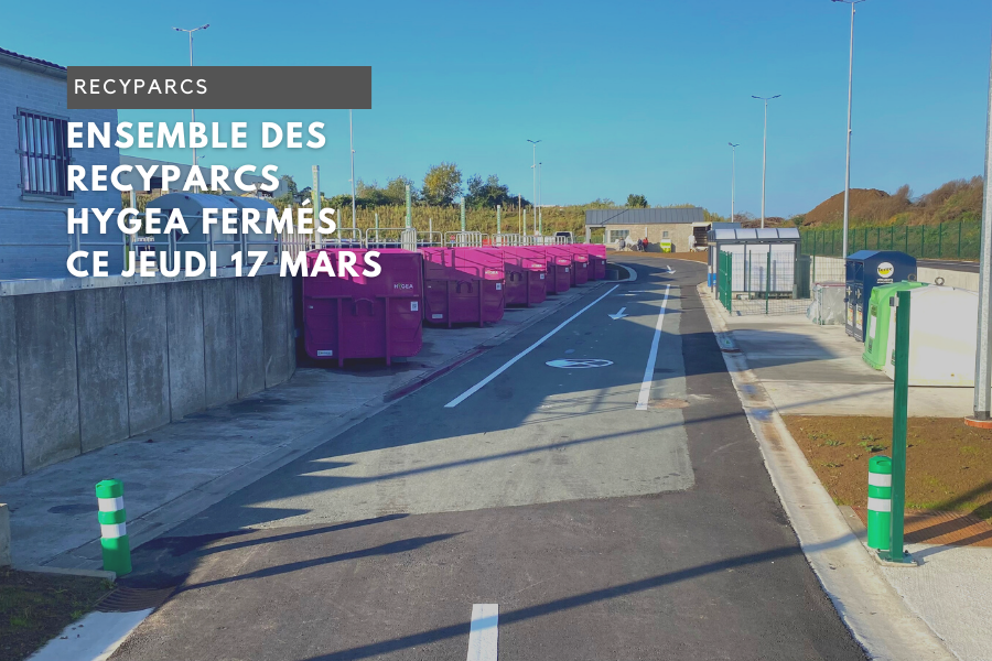 Dans le cadre d'une formation des préposés Recyparcs, l'ensemble des Recyparcs Hygea seront fermés ce jeudi 17 mars. Ils rouvriront leurs portes le vendredi 18 mars aux horaires habituels.