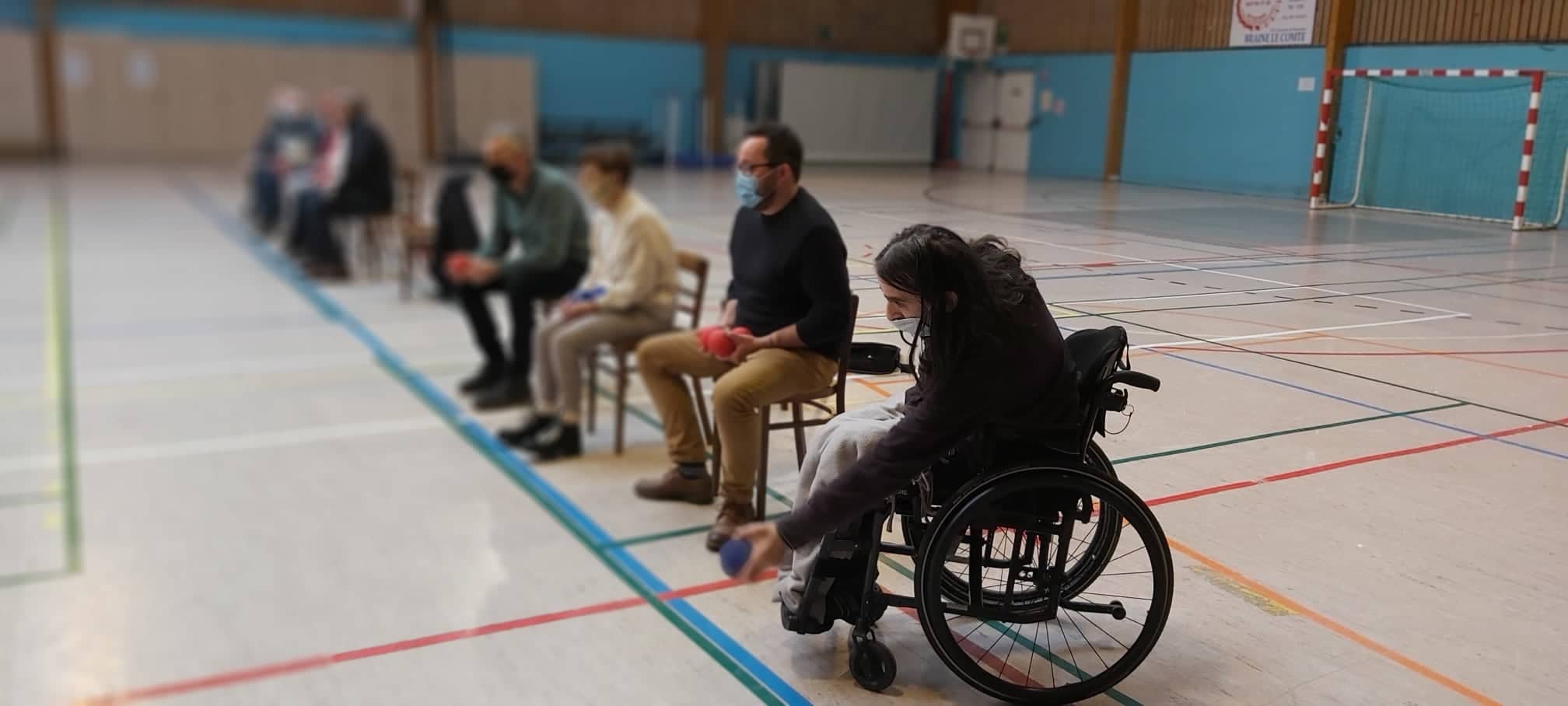 La Boccia est une pétanque adaptée. La particularité, c'est que tout le monde doit être assis. Le matériel est très spécifique. Les boules sont en cuir et, à l’intérieur, il y a du sable. Cela permet aux personnes tétraplégiques, comme moi, d’avoir une préhension plus facile de ces boules. Je ne pourrais pas porter une boule classique à cause du poids. Et, comme elle est lisse, elle glisserait de ma main.